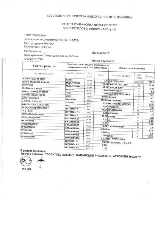 Комбикорм ДК-51 для перепелов (Истра) / 5кг 270 ₽ Полнорационный комбикорм для несущихся перепелов. Полнорационный комбикорм для несущихся перепелов. Описание Комментарии 0 Описание Комбикорм ДК-51 производства ООО “Агроцентрсбыт”, для несущихся перепелов. Фасовка по 5кг. Полнорационный комбикорм для несущихся перепелов. Комментарии 0 Добавить комментарий